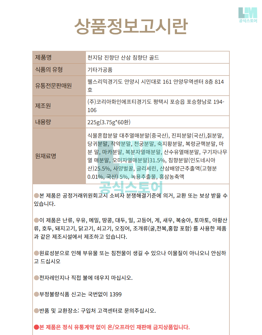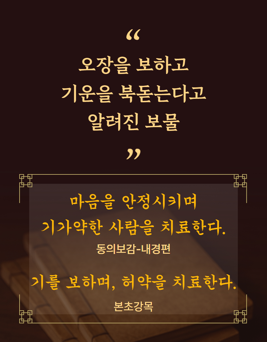 식물혼합분말 대추열매분말(중국산), 진피분말(국산), 칡분말, 당귀분말, 작약분말, 천궁분말, 숙지황분말, 복령균핵분말, 마분말, 마카분말, 복분자열매분말, 산수유열매분말, 구기자나무열매분말, 오미자열매분말]31.5%, 침향분말(인도네시아산) 25.5%, 사양벌꿀, 글리세린,산삼배양근추출액(고형분0.01%, 국산)5%, 녹용추출물, 홍삼농축액